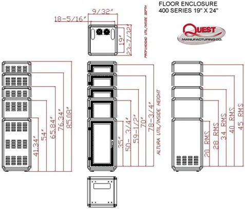 Quest's 400 series enclosures are available in a variety of heights and colors and are designed for mounting Telecommunications, Datacommunications, Security, Broadcast and other 19'' electronic equipment. Quest enclosures are manufactured to ANSI/EIA RS310-D Standards.