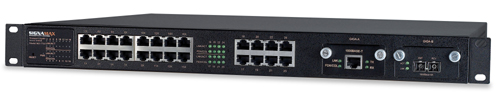 Signamax Connectivity Systems' 065-7732A Gigabit Ethernet Access Switch provides two optional Gigabit Ethernet connections, and it is a fully functional SNMP-managed 24-port 10/100 switch as well. Two redundant, load-sharing, hot-swappable power supplies are standard equipment. The two optional Gigabit Ethernet ports permit creation of a Gigabit backbone network with 24 10/100 ports per switch for workstation and server connectivity. Full SNMP management capabilities are included, with web browser, local terminal and Telnet remote terminal connection usable simultaneously with real time updating. It also communicates with network management systems such as HP OpenViewTM via SNMP for enterprise-wide status display, statistical monitoring, and switch control. Layer 3 look-ahead routing features and IEEE 802.1p Class of Service / 802.1Q Tagged VLAN support provide a complete package for convergent networks. |