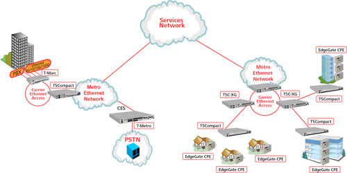 The T-Metro provides access to advanced data services such as virtual private LAN services (VPLS), virtual private wire services (VPWS) and IP virtual private network (IP-VPN) services. In addition, the T-Metro product line enables service providers to carry native TDM traffic transparently across the packet switched network (PSN), using various circuit emulation techniques. The TDM traffic is encapsulated in Ethernet or IP frames to emulate the functionality of a TDM circuit, ensuring that all original feature-set is preserved. |