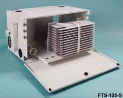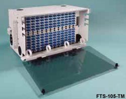 The FTS-105 Series of 5U high rack-mounted fiber splice and termination cabinets from Century Fiberoptics are our largest rackmount units. They offer high capacity with the same ease of use as our smaller units. Designed for maximum flexibility, the series includes variety of functional options and accessories. The units are easily configured to meet termination, interconnection or cross-connection requirements. The FTS-105 cabinets can be used on frames with either front or back access and will accept cables from the front, rear, top or bottom. Access to the front is through the removable hinged door. A removable back cover provides rear access. An optional lock is available for the front door. The cabinets can be configured for splicing only, termination only, or a combination of both. Flexible design allows mixing of connector types and the installation of only the adapters needed for the current application. Adapter panels accommodate ST, SC, FC, LX.5, LC, E2000, and other adapter types.