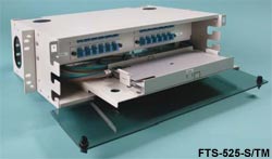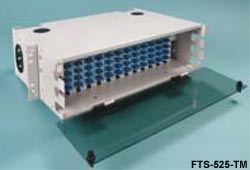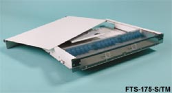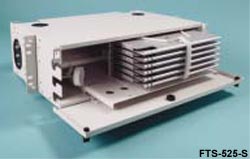 The FTS-525 Series of 3U high rack-mounted fiber splice and termination cabinets from Century Fiberoptics are compact, durable and easy to assemble. Designed for maximum flexibility, the series includes variety of functional options and accessories. The units are easily configured to meet termination, interconnection or crossconnection requirements. The FTS-525 cabinets can be used on frames with either front or back access and will accept cables from the front, rear, top or bottom. Access to the front is through the removable hinged door. A removable back cover provides rear access. An optional lock is available for the front door. The cabinets can be configured for splicing only, termination only, or a combination of both. Flexible design allows mixing of connector types and the installation of only the adapters needed for the current application. Adapter panels accommodate ST, SC, FC, LX.5, LC, E2000, and other adapter types