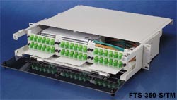 The FTS-350 rack-mount cabinet accommodates up to 36 direct or spliced terminations. The six-pack panels are available in all common connector styles, either empty or loaded with Century Fiberoptics adapters.