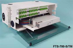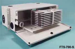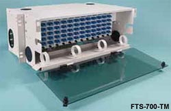 The FTS-700 Series of 4U high rack-mounted fiber splice and termination cabinets from Century Fiberoptics are slightly larger than the FTS-525 cabinets, with a bit more “working space” in the back for the technician. The extra rack unit also increases the capacity of the cabinet when used in the Splice and Terminate configuration. Designed for maximum flexibility, the series includes variety of functional options and accessories. The units are easily configured to meet termination, interconnection or cross-connection requirements. The FTS-700 cabinets can be used on frames with either front or back access and will accept cables from the front, rear, top or bottom. Access to the front is through the removable hinged door. A removable back cover provides rear access. An optional lock is available for the front door. The cabinets can be configured for splicing only, termination only, or a combination of both. Flexible design allows mixing of connector types and the installation of only the adapters needed for the current application. Adapter panels accommodate ST, SC, FC, LX.5, LC, E2000, and other adapter types.
