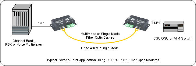 The TC1630 Fiber Optic T1/E1 Modem is typically used to link Channel Banks, PBXs,
